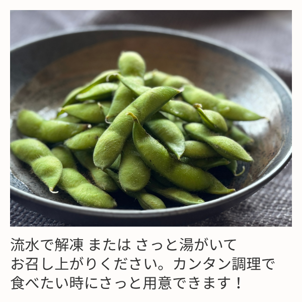 いつでも手軽に解凍して直ぐにいただけ、しかも一年中季節を選ばず手に入るのは助かります。 塩を入れた熱湯に数分入れて、暖かくした枝豆でいただいてます。