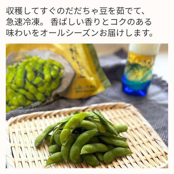 ご購入いただきありがとうございます。 旬の時期に出荷後すぐに茹で上げ、急速冷凍施設で冷凍しておりますので、美味しいだだちゃ豆を通年でお楽しみいただけます。 今後ともご愛顧いただきますようお願い申し上げます。