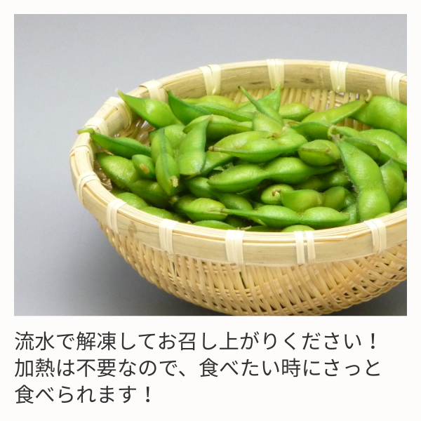 いつでも手軽に解凍して直ぐにいただけ、しかも一年中季節を選ばず手に入るのは助かります。 塩を入れた熱湯に数分入れて、暖かくした枝豆でいただいてます。