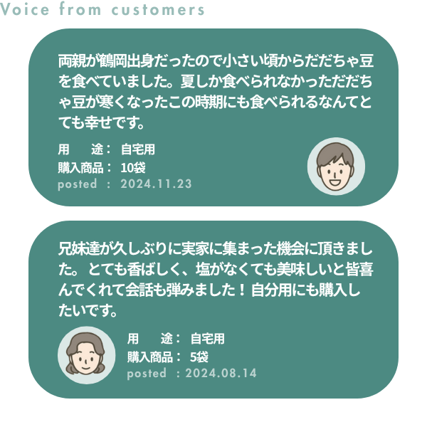 庄内出身の母が、「毎年一回の贅沢」と言って、だだちゃ豆を毎年少しだけ注文していたのですが、この度こちらのサイトから注文できることを知り、息子の私が母へのサプライズとして、多めに送ってあげました。とても喜んでくれています。注文してすぐに発送してくださり、またご連絡もマメで、ありがたかったです。また今後ともよろしくお願いいたします。